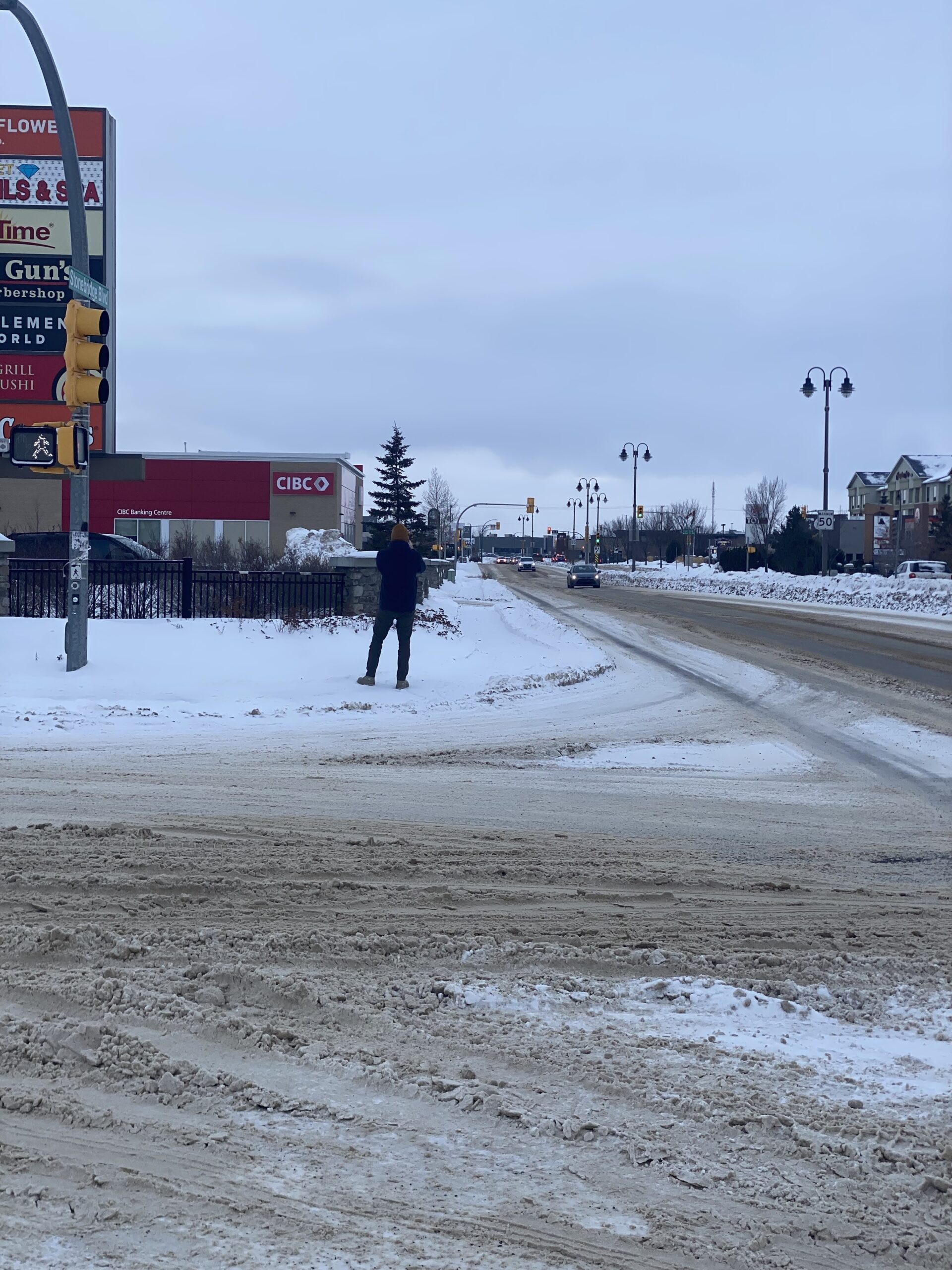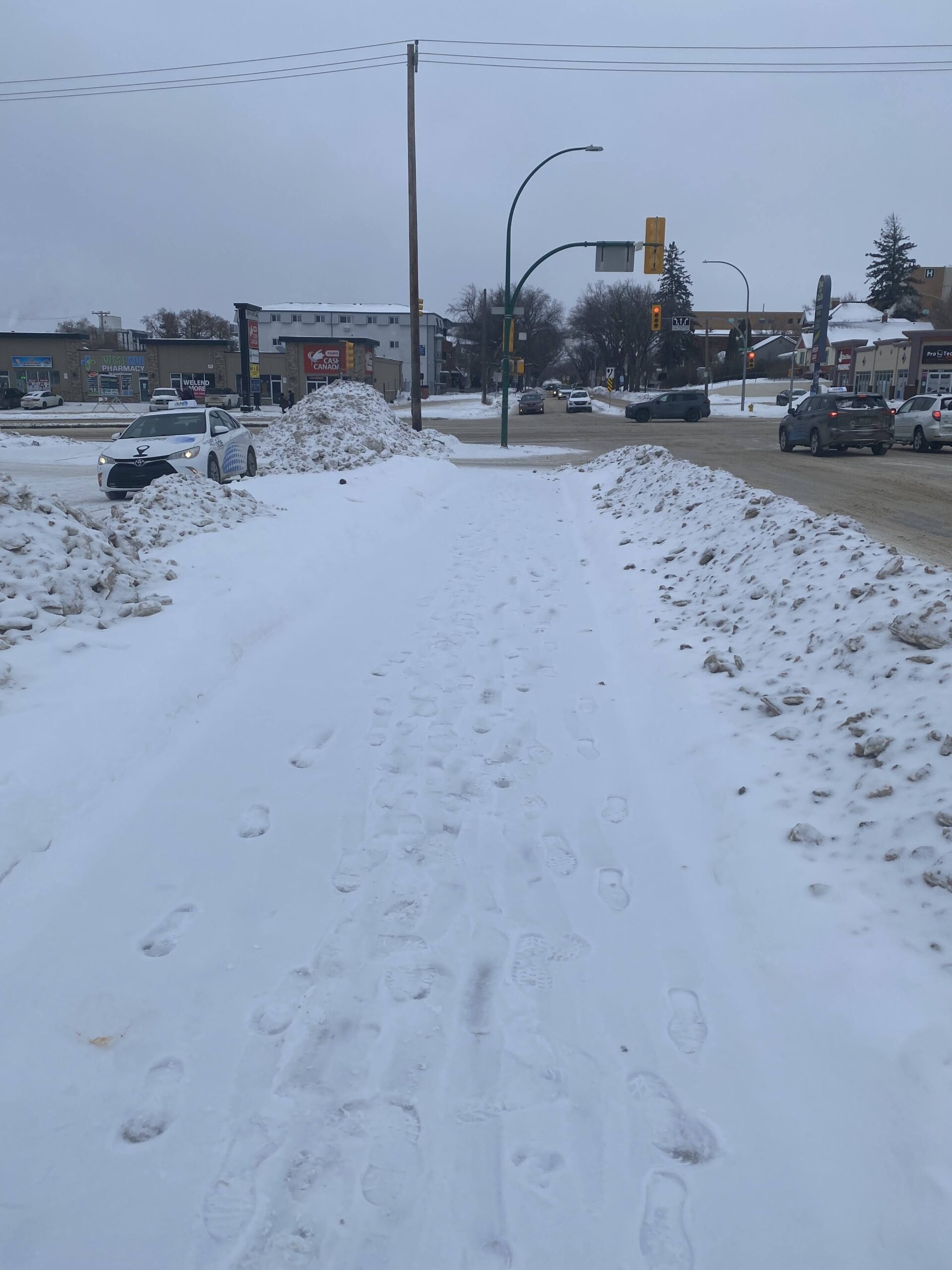 Desire paths on the west side of 22nd from Diefenbaker to ConfederationIn the absence of any sidewalk on 22nd, icy shortcutting through the Tim Horton’s drivethrough is popular.